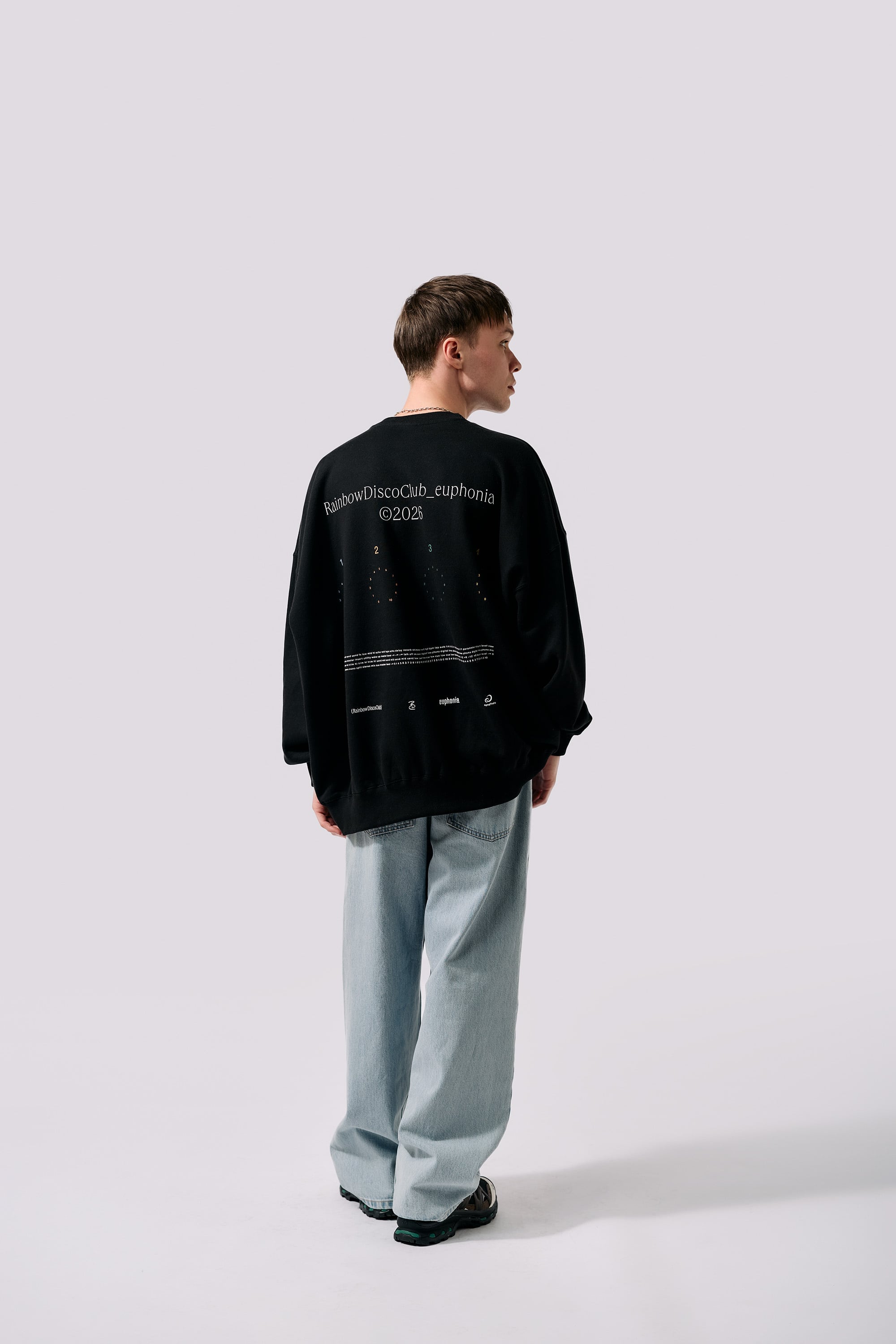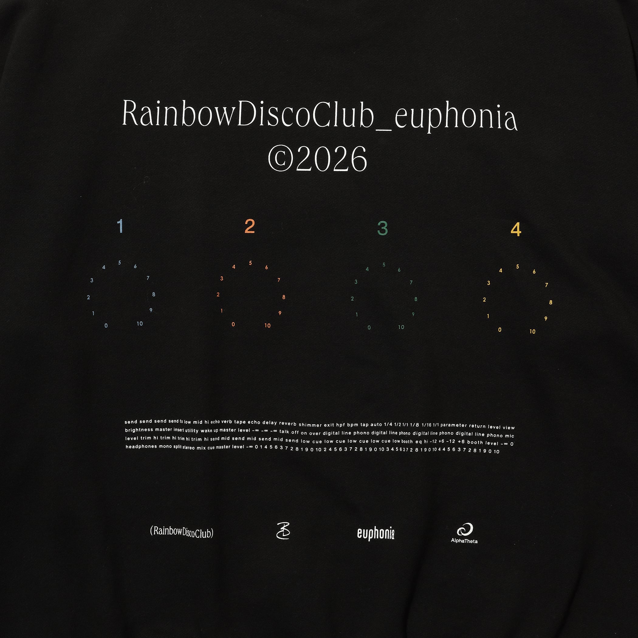 RDC 2025にAlphaThetaから発売されているロータリーミキサー「euphonia」のデザインをカスタマイズ。世界で1台だけの特別な「euphonia」が完成し話題となりました。そのデザインをビックシルエットスウェットに大胆に配置。目を惹くカラーの配色もポイントです。